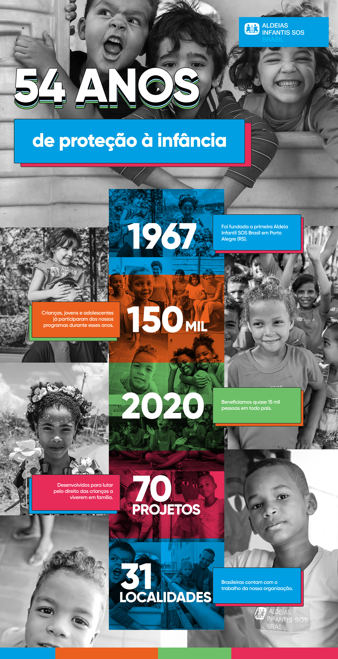 Nossas atividades começaram em Porto Alegre (RS), em 1967, e desde então, 150 mil crianças, jovens e adolescentes já participaram de nossos programas. Atuamos em três pilares principais: fortalecimento familiar, cuidados alternativos e advocacy. Todos os nossos esforços são para que nenhuma criança tenha que crescer sozinha, para isso, desenvolvemos mais de 70 projetos sociais em 31 localidades do país. Veja o impacto do nosso trabalho: