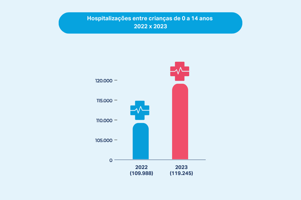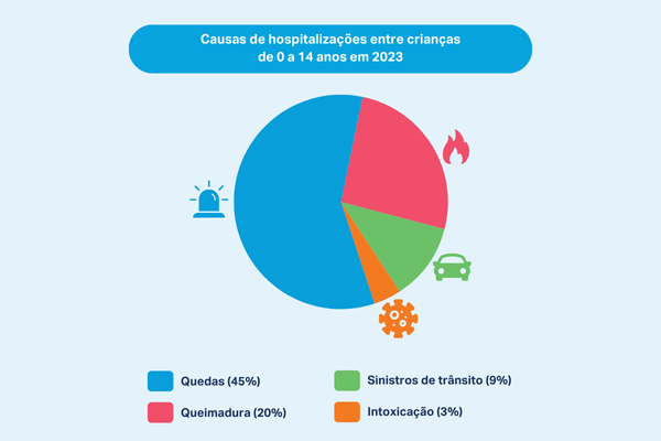 Após uma queda de 6,3% nas internações de crianças e jovens na faixa etária entre 1 e 4 anos, de 2021 para 2022, houve um aumento equivalente no intervalo entre 2022 e 2023, com destaque para casos de afogamento (+76%), sufocação (+52%) e intoxicação (+36%). Sufocação também teve destaque nos casos que atingiram crianças menores de um ano, com aumento de 9%. Nessa faixa, ainda tiveram alta casos de queimadura (+7%), quedas (+5%) e intoxicação (+5%).