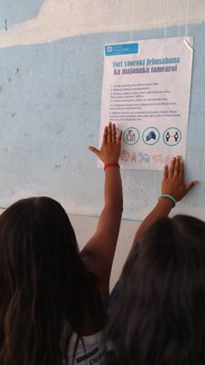 Como resultado do aprendizado, eles elaboraram um panfleto no seu idioma nativo, com as informações de combate ao vírus, e distribuíram às famílias acolhidas nos centros do projeto e à comunidade do entorno. Nas áreas externas dos abrigos também foram anexados cartazes com as informações de prevenção.