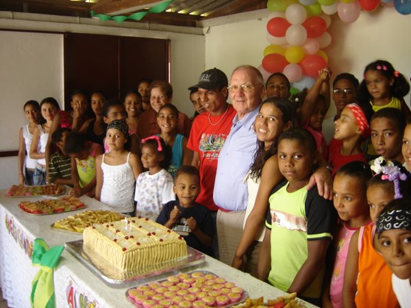 Jon Petersson no meio dos irmãos Leomar e Graciane e com outras crianças da Aldeias Infantis durante a comemoração do seu aniversário / Arquivo pessoal